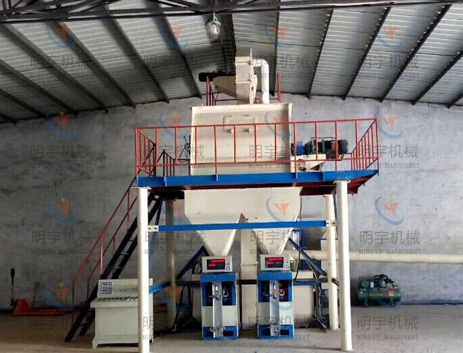 工人根據配比將原料依次投入加料斗內,由斗式提升機將物料提升至臥式無重力攪拌機,混合2-3分鐘(根據不同物料混合時間略有差別)。混合好的物料依靠自身重力落至成品倉,成品倉下部配全自動稱量包裝機,將混合好的成品裝袋包裝。在包裝過程中,可以重復上面投料、提升、攪拌等過程,以實現流水線作業,提供生產效率。